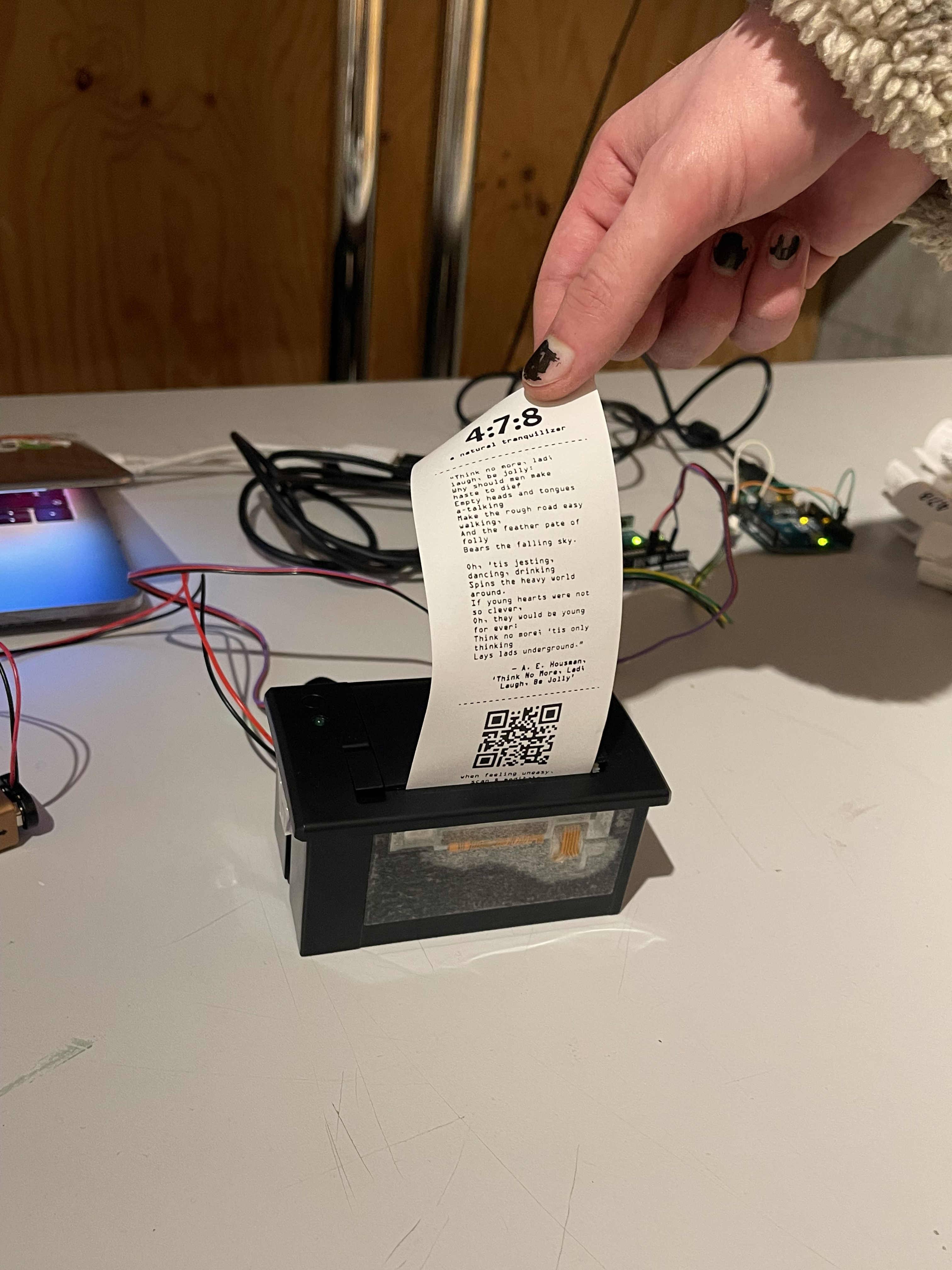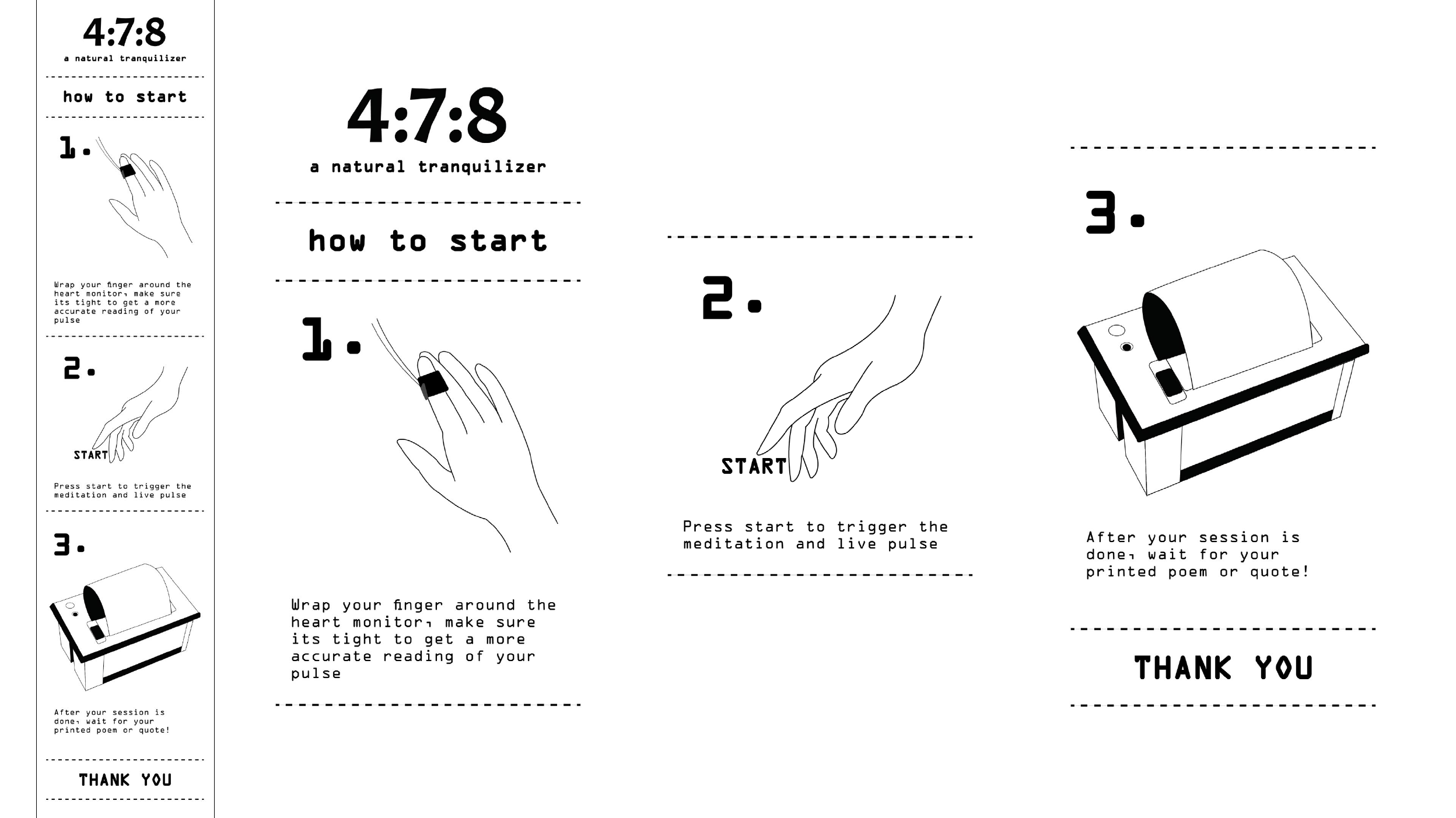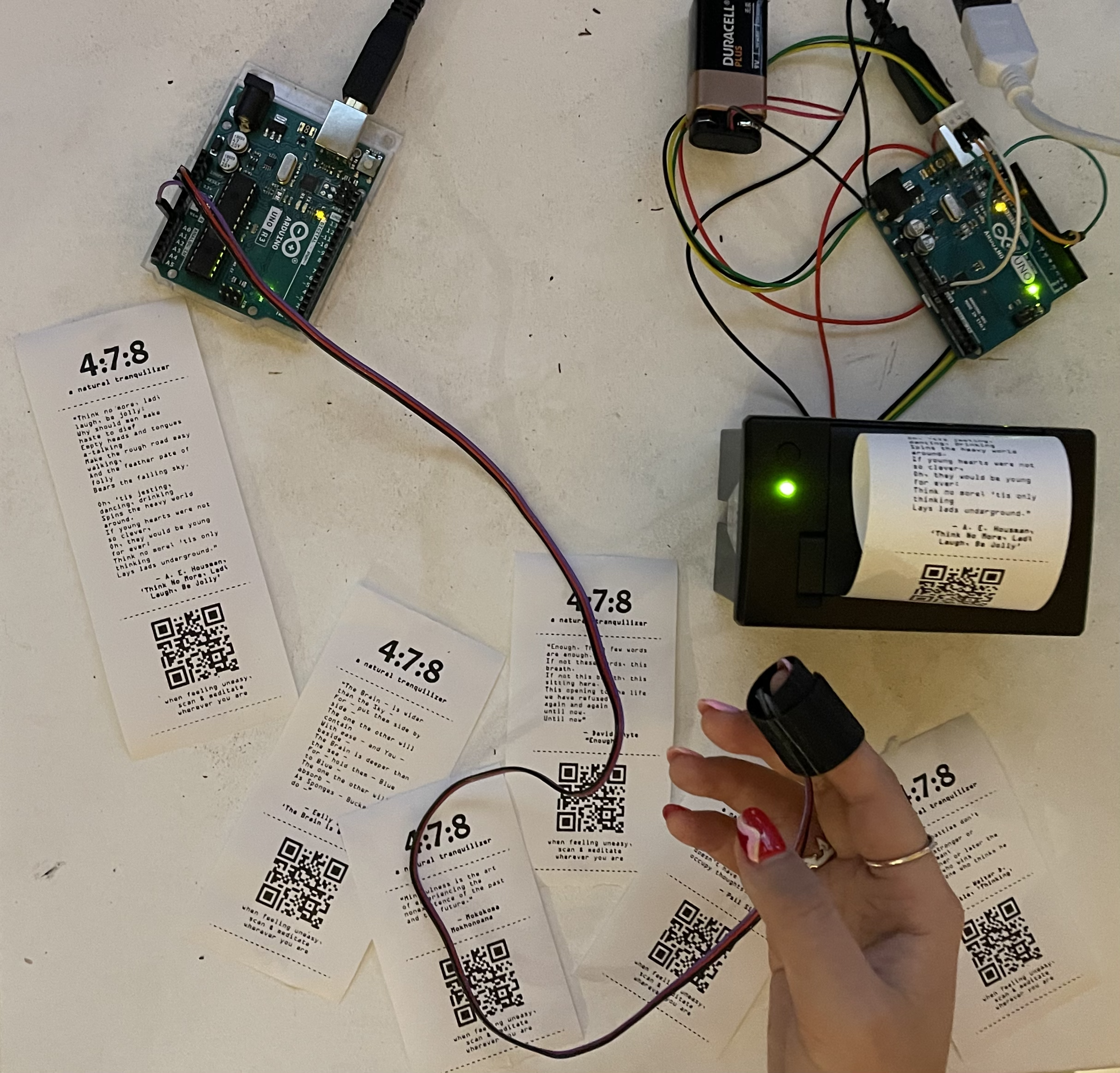 The interactive aspect is done by using a heart monitor that the user must be connected to during the session. It allows them to see the changes in their rate. After the session is done, a poem about mindfulness is printed for them to take. The program calculates the rates from start to end, therefore the length of the poem is determined by the intensity, the higher the rate, the longer poem.